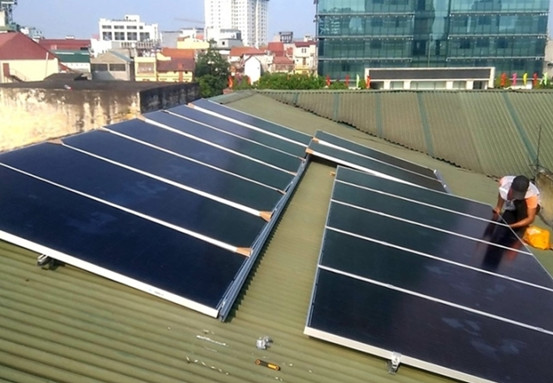 Tấm pin năng lượng mặt trời được lắp đặt tại trường THCS Nguyễn Trãi, quận Ba Đình