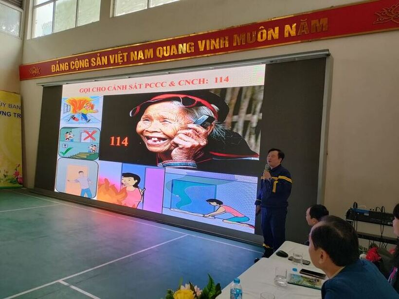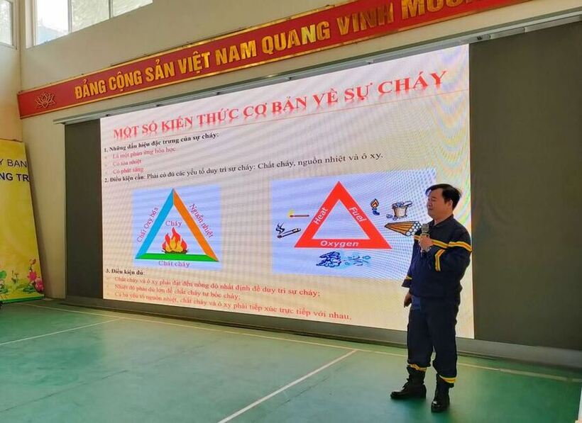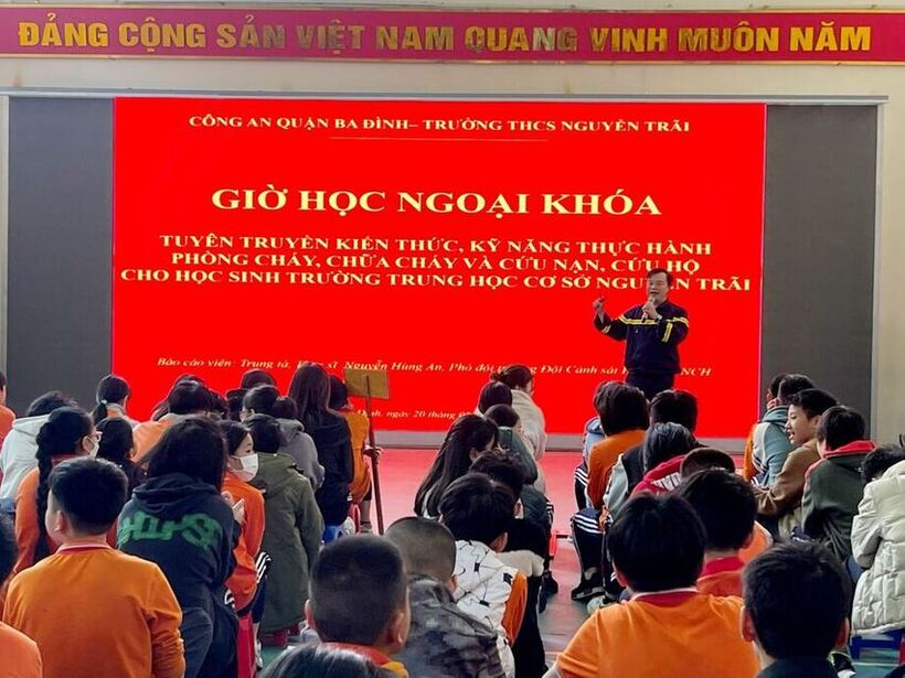 Tiếp theo là nội dung Tuyên truyền tập huấn kĩ năng phòng cháy chữa cháy trong trường học do Trung tá, thạc sĩ Nguyễn Hùng An - Phó đội trưởng đội cảnh sát PCCC & CNCH công an quận Ba Đình trình bày. Báo cáo viên đã nêu ra những nguy cơ gây cháy, nổ; những biện pháp phòng cháy và được các con học sinh đón nhận rất chăm chú.