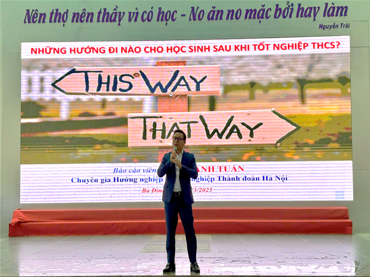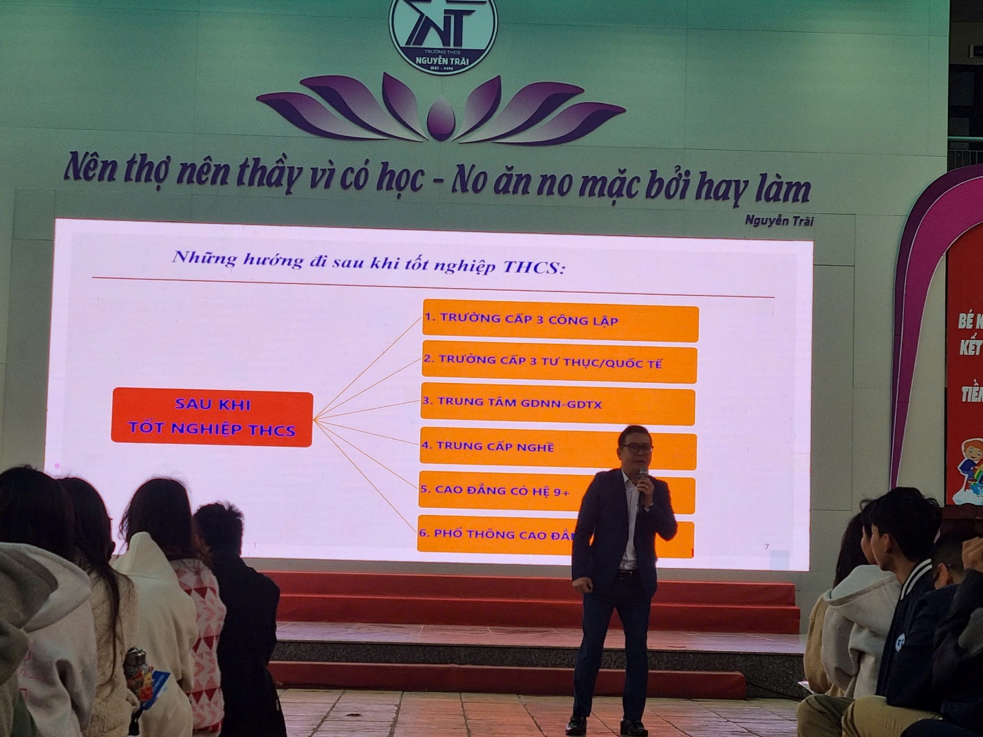 Chương trình diễn ra với nhiều nội dung thiết thực, chuyên gia Lê Anh Tuấn đã trực tiếp tư vấn, chia sẻ về định hướng nghề nghiệp và lộ trình học tập sau THCS, giúp học sinh hiểu rõ hơn về các lựa chọn phù hợp với năng lực và nguyện vọng cá nhân. Bên cạnh đó, các trường và đơn vị giáo dục tham gia đã giới thiệu chương trình đào tạo, cơ hội tuyển sinh và triển vọng nghề nghiệp. Học sinh và phụ huynh cũng có cơ hội tham quan các gian hàng thông tin, lắng nghe tư vấn trực tiếp từ đại diện các đơn vị tuyển sinh để có thêm cơ sở đưa ra quyết định phù hợp.