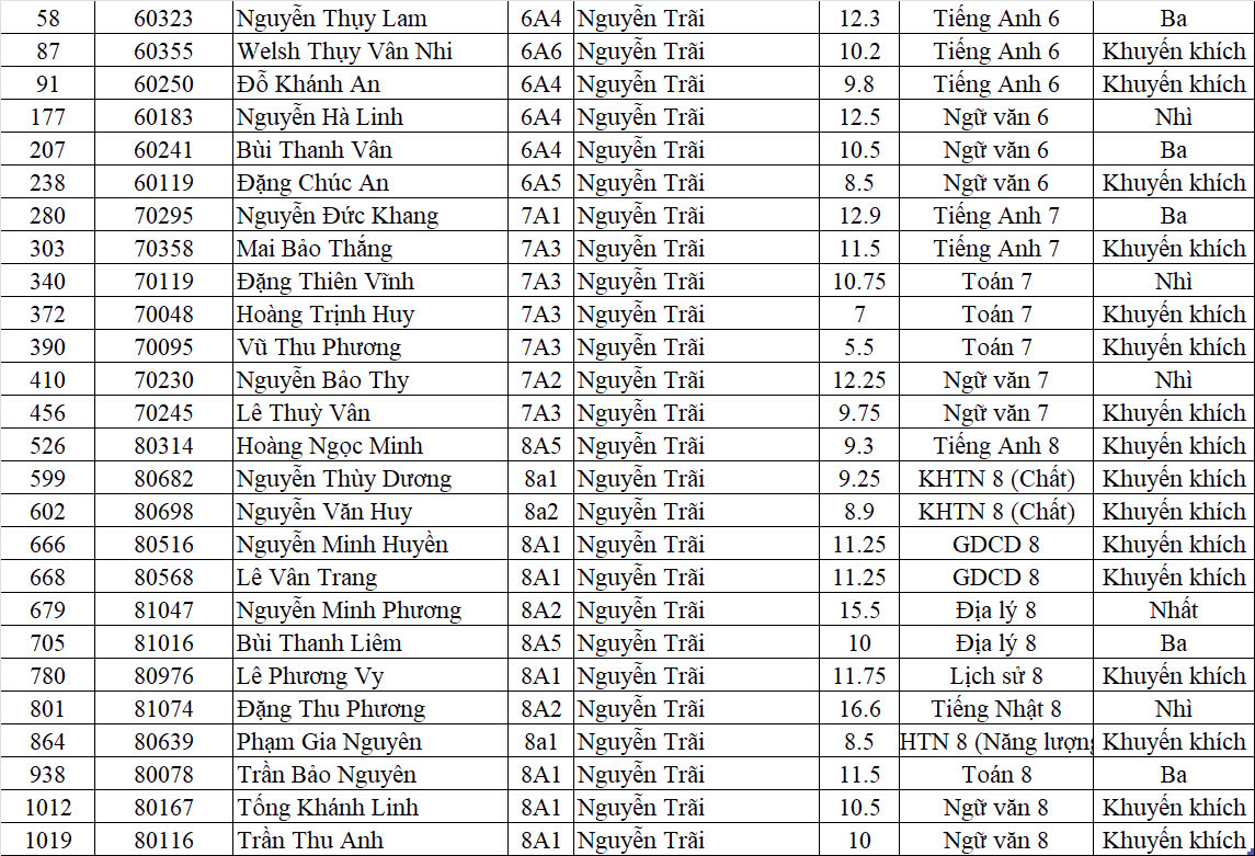 Hòa chung không khí hân hoan của những ngày cuối năm học, toàn thể thầy và trò cùng quý vị phụ huynh trường THCS Nguyễn Trãi đang tràn ngập niềm tự hào khi đón nhận tin vui từ Kỳ thi Olympic cấp Quận: 26 em học sinh tài năng của chúng ta - những gương mặt tiêu biểu đến từ khối 6, 7, 8 - đã xuất sắc chinh phục thử thách, mang về những giải thưởng danh giá, tô điểm thêm vào bảng vàng thành tích rạng rỡ của nhà trường.