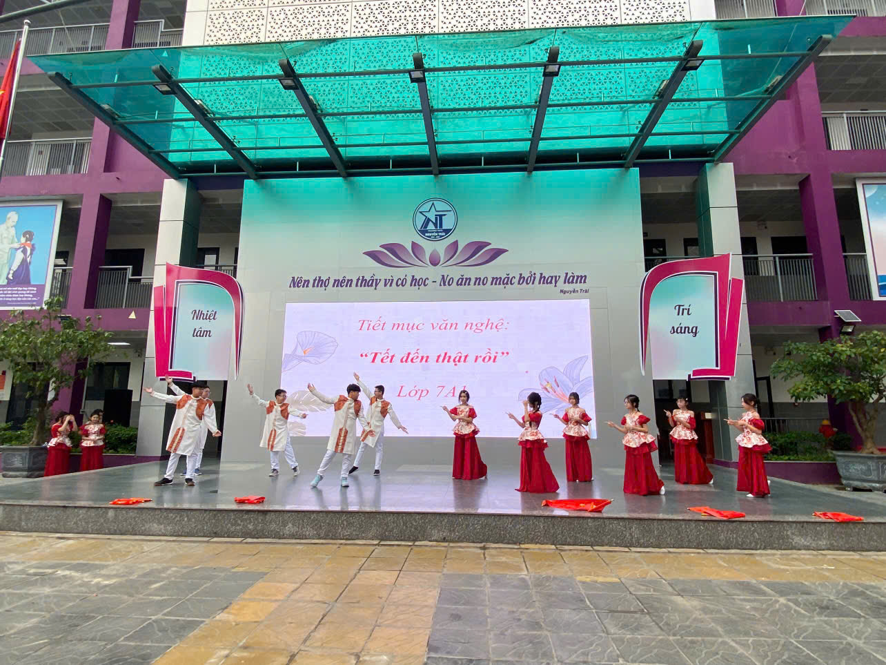 Mở đầu chương trình là nghi thức chào cờ trang nghiêm của toàn thể thầy cô và học sinh trong trường. Sau đó, lớp 7A1 đã mang đến tiết mục văn nghệ đặc sắc với bài hát “Tết đến thật rồi”, tạo nên bầu không khí vui tươi và nhận được nhiều tràng pháo tay từ các bạn học sinh.