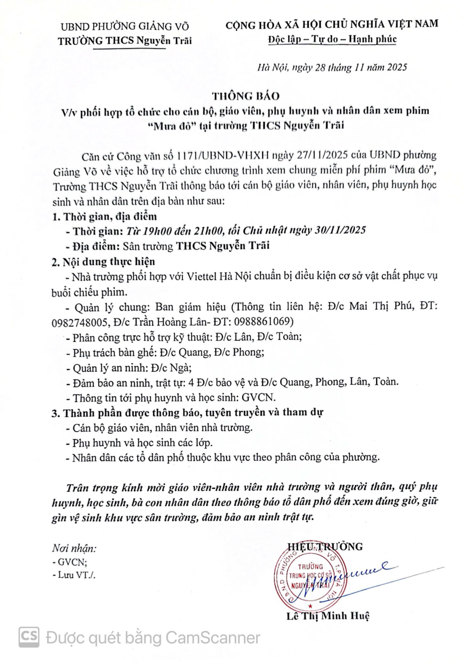 Trân trọng kính mời đồng bào cùng xem “Mưa Đỏ” tại THCS Nguyễn Trãi - phường Giảng Võ vào 19h-21h ngày 30/11/2025!
