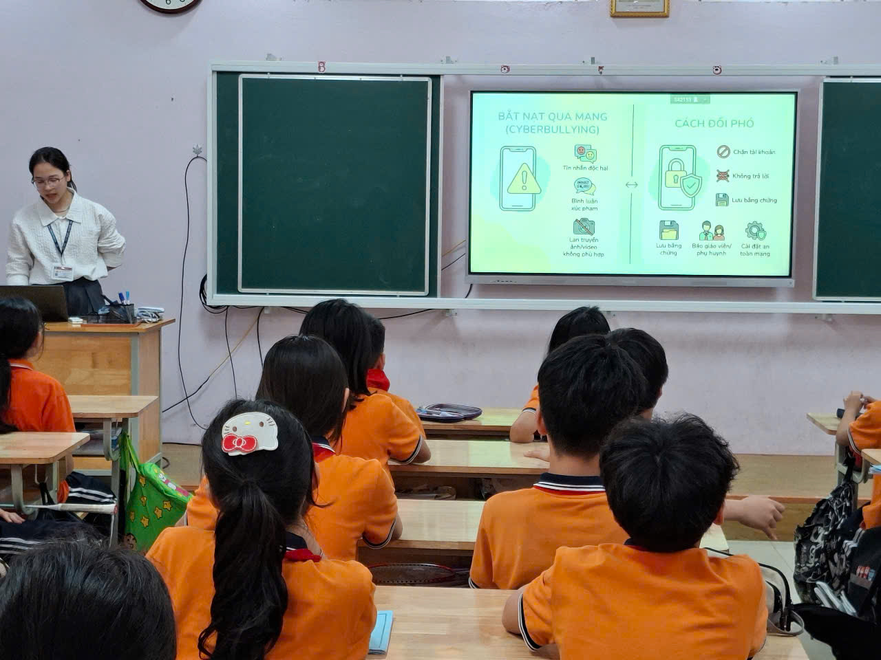 Mở đầu chương trình, các cô giáo sinh thực tập đã khéo léo dẫn dắt bằng những câu chuyện thực tế và các câu hỏi gợi mở, giúp học sinh nhận diện rõ hơn các biểu hiện của bạo lực học đường như bạo lực thể chất, bạo lực tinh thần, bắt nạt qua mạng hay sự cô lập trong tập thể. Thông qua phần chia sẻ này, các bạn học sinh đã hiểu rằng bạo lực học đường không chỉ là những hành vi đánh nhau mà còn có thể xuất phát từ những lời nói, hành động vô tình gây tổn thương đến người khác.