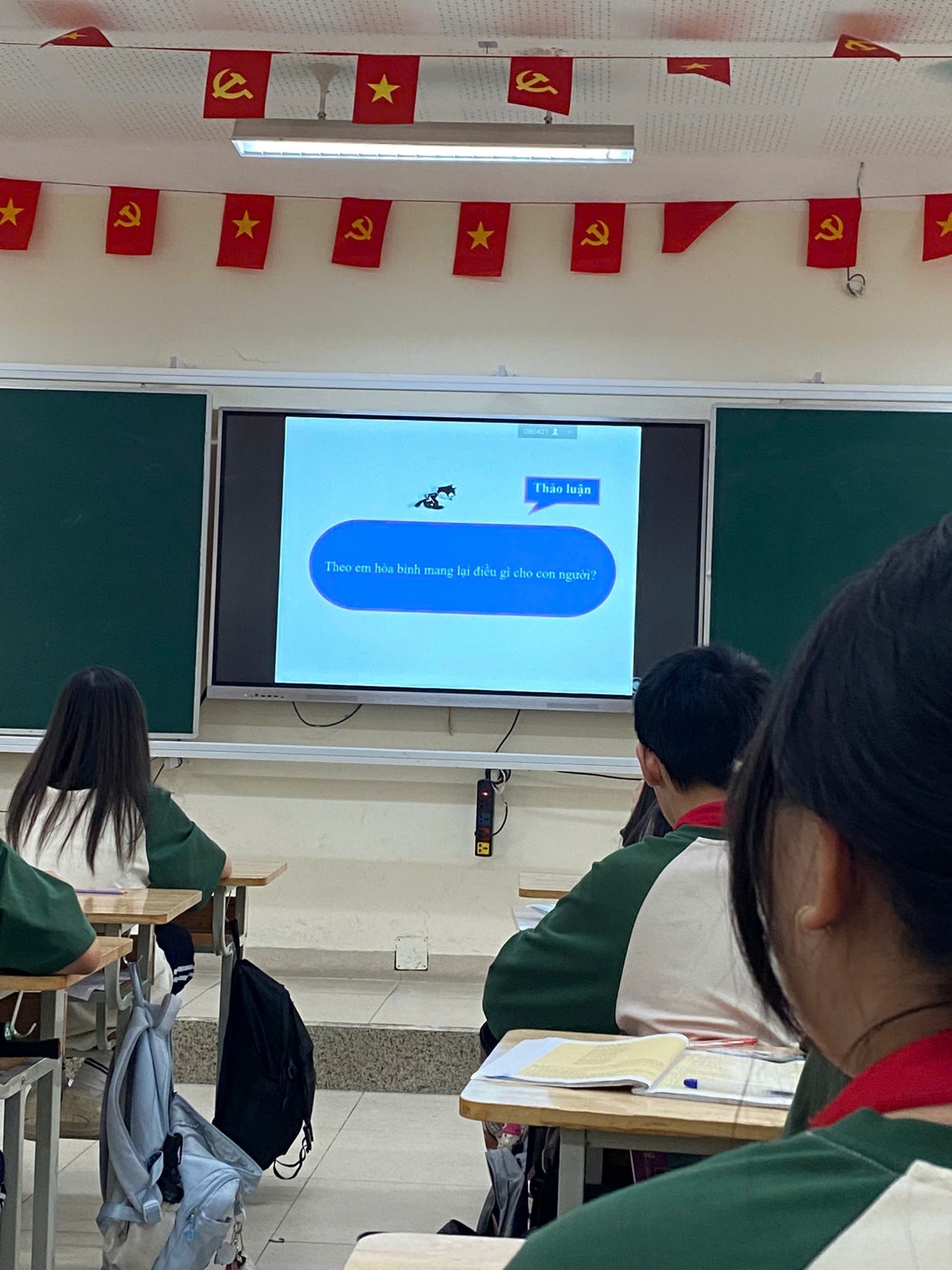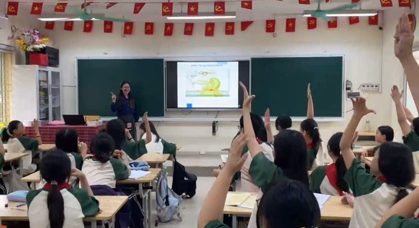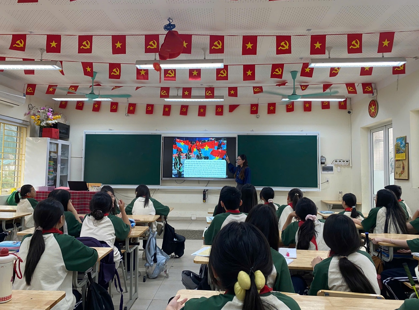 Hình ảnh cả lớp chăm chú nghe giảng về ý nghĩa của lá cờ Mặt trận Dân tộc Giải phóng miền Nam Việt Nam